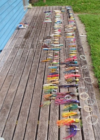 ...these are just the lures I had on hand on the boat in the Sollies last trip after they had been washed... not shown are the dozens still hanging up in Joes tackle shed, the box or two more i sent up recently in that container, and all the ones still here at home for emergency use for short notice overseas trips! :-)