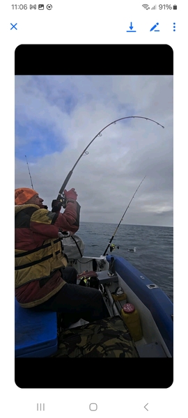 Things didn't stop there shortly after that one I hit another goodie, this time a 10 kg fish which I quickly unhooked and released. Hinga chimed in with an 8 kg then as low tide approached and the current eases the fishing went quiet again so we called it a day at 2pm. Ive included a photo of hooking into a big one, it shows the angle of how far from the boat I strayline. Dont be shy of casting baits as far as you can. The other two, me struggling to hold fish up with one hand and after weighing at the butcher shop. Cheers...