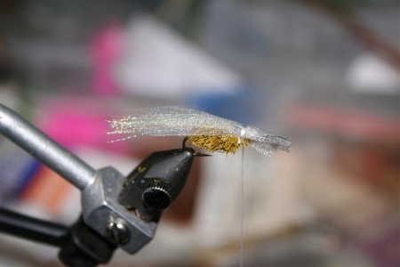 These then get tied in on top of the midge flash. Use the same pinch technique with the thread we used earlier for our spinning of the deer hair ensuring the wings tie in flat.