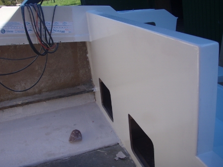 As the transom is not dead flat, but curves in at the sides, I had to build up mounting pads - not a big job, but as I haven't done any glassing in over 20 years, I'm quite happy with the job I did: