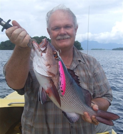 Edit:- the pinkie I had there is the floating version, which was great, being hot pink I was able to see just where the lure was, made it a bit more fun I reckon. I had I think 3 casts with the blue/black/silver jobbie, first cast nuthin', second cast the little GT, third cast a huge white hole in the ocean and a long unstopable run around a bommie, bugger it! After that I was way more circumspect about using the pinkie, it still survives up there awaiting my return in January.