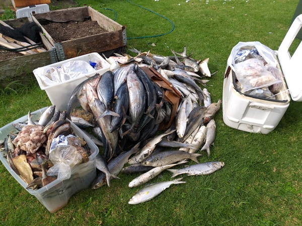 It will handle decent sized whole ky and skippies but it did occasionally jam up. Filleting and chopping up the frames with an axe was faster, no worries with skin, scales or whole heads, just feed them thru. And the texture/consistancy of the berley is perfect with just one pass.
