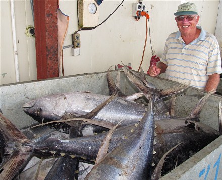 .... just a few of the tons of yellowfin that go into the cannery up here every week. These are 30-40kg fish. The longliners get yfin over the 100kg mark, which is a hassle as they have to be individually weighed on a separate, larger, set of scales!