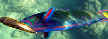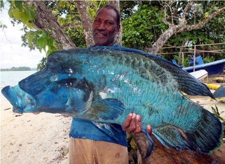 Been a few dys, more of the same old same old really. warm, lazy days, a little fishing here and there, it has been our mid-triphiatus these last few days, that and 8 yachts (5 more due in the next day or so) have made things here at the resort a little hectic . Still, cliff and I headed out into the wind tossed ocean, battled bravely thru the massive waves to fish the rough waters off kohinngo island. Just trolling along with halco's.... like I said, we're getting lazy... picked up a few coral trout (highfin coral trout)  .... ... and after a while Cliffie bagged a small dogtooth tuna, just a puppy....  .... but he was stoked to bag a new species, and also a chance to have dogtooth sashimi, supposed to be the premier of raw fish. Good luck with that, yuck. :-) Finished off with bit of poppering, more of the same, picked up 5 or so kingfish, and got back to find a spearfisherman had a maori wrasse for sale to the restaurant..., .... beautiful fish, and apparently the lips are worth hundreds of dollars per kilo on the asian markets, but hey, never mind :-) Well, feel a lazy day coming on tomorrow, but we'll see....