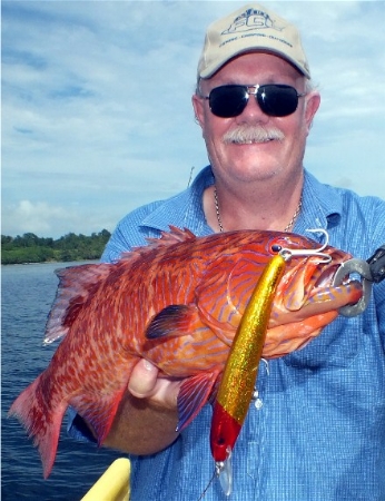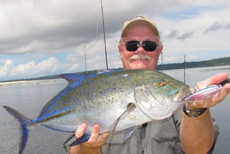 Now now Eric, you could always come on up to play here yourself you know! Bazza and his mate Adrian have headed out early, though there is a pretty good breeze from the south today, so they will likely be restricted to trolling the diamond narrows or maybe the sheltered parts of the blackett straits. They should do ok though. Just to catch up a couple of pics, from the day before yesterday, we picked up a nice coral trout on 6lb spin tackle over shallow coral reef over near double island.... that is one of the little berkley 3B crankbaits (yanks give lures clunky names don't they?) "sub-dog", and yesterday, Cliffy bagged this little trev....well, quite a nice trev actually....  .... not too sure of the species of trevally, maybe.... maybe.... a young golden trev, although I don't really think so. This was on a little 3B lure as well...a very cute little lure. Well, no idea what we'll be doing today, may head out later in the day, but both Cliff and I kinda think today would be a very good day to have a break. Standing in a boat constantly casting for 5-6 hours tends to bugga ya back a little :-) Later dudes, Stu. Oh, Steve, mate, I told you , ya shoulda come up too! You could've brought some venison up too! ;-)