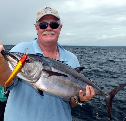 nice little dogtooth, trolling past manta ray. Note the rough sea state, borderline for fishing up there, soooo rough! :-)
