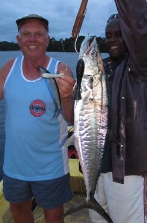 After seeing Bazza and Adrian with their haul of pesky piscines, I must admit my resolution to avoid fishing for the day wavered, so we decided to head out around 4pm for our own looksee. It had been a windy and wet (but still warm) day today, but miracle of miracles, at bang on 4 pm it cleared, so Cliff and I were able to clear off for the Diamond narrows area as per plan. we tried a few new spots, Cliff dropping a nice fish off Goldie, until we wound up at "the bommie" at the bottom end of the Diamond Narrow. A couple of casts in and my little R2C dumbbell popper got smacked, and soon a fat little 3kg bluefin trev was in the boat..... phew, the monkey was off me back! ;-) Nopics though, as this was just standard bluefin no;4975, so we carried on. Soon Cliffy had a baracuda on the deck as well, in the process of releasing same our driver, Harold, managed to wear the tail hook thru the skin of his thumb. No biggies really....after all, itwasn't MY skewered skin :-)... and by simply squeezing down the barb we were able to roll the hook out backwards, no worries. Still, that put the hex on that spot, so we took off for the top of the Narrows to see what was going on there. Short answer, sod all. poppered all along the reefs and bommies until we neared the marker at the start of the narrowsagain, having done a huge loop around tonys Island, Noro Bommie and the diamond reef, a good hour of solid casting, for the grand total of twohalf-hearted follow ups. things were looking decidedly average, when just as I was about to call it quits, some long-toms mugged somme baitfissh off our bow. I shot a quick cast out over the area, and half way back a large longtom skiped in and to our surprise impaled itself on me popper. OK, a bit of fun, but..... hang on! Behind us several patches of baitfish were rising to the surface, as if someone had flicked a switch. Well boys and girls, from then on it was all go. Baitfish were getting munted all about us, Harold killed the motors so we drifted slowly down the inlet towards noro on the gentle breeze, casting left and right around the boat as baitschools were coming into range. Fun? Oh yes. yes indeed....  ... a none too shabby GT nailed the tiny dumbbell on my nice 20lb light popper set, followed by several explosions behind Cliffs lure that left him cursing the %&$^#@ short-sighted stupid fish, with fait justification I must say. I took the time after landing my fish to get pics (well, obviously), and changed to a larger R2C dumbell, as it was getting darker and I wanted something a little more visible. First cast, and as I started winding, cliff yelled, "Got one! At last, where's the gaff!"... as he said this, my lure too got eaten with extreme prejudice, so I never had the chance to admire his capture before I was locked into another good fish..... before long Ihad my own need for the gaff, a good Mackerel! sweet!  .... and then I was able to admire Cliffs capture.... as Harold gaffed my fish, he held it with Cliffs, and Isnapped off a quick shot....  .... ...it was a hoot. for the next 30 mins or so it was mayhem.... so many blind fish missed shots at our lures, mackerel were smashing bait from below and exploding skywards for several metres, sharks were slamming the bait schools, and one of the biggest GTs any of us have ever seen chased my popper clear out of the water without hooking up (thank heavens, no way would the little set have handled the beast).... it was awesome, we kept trying til it was well dark, and we headed home with bait being chased all around us. Awesome afternoon.... I gotta say, I love the Solomons, Zipolo Habu is just frikken AWESOME!!! :-) Well, I am bushed, gonna go hit the hay now, nite all!