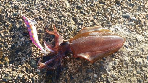 All of the squid followed the egi right to my feet, and I had to tease them into taking it. They would rush at it, stop, back off, start to swim away, then turn around, rush it, etc. Polarised sunglasses really helped today.