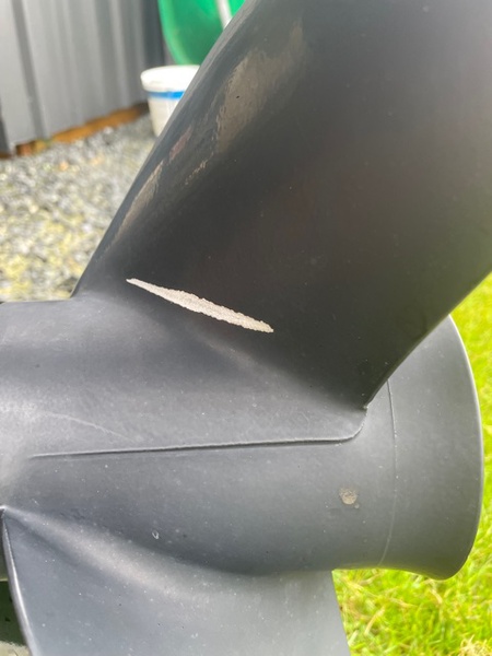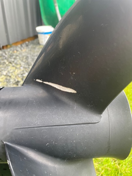 Wear marks on same position on each blade of prop with spec of 3 x 14 x 17. Boat also came with a 2nd prop.....3 x 13.74 x 21. Pictures below of wear to blade (all 3 blades have similar wear).
